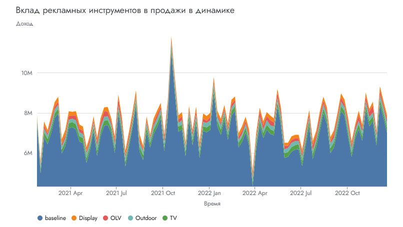 Этот инструмент идеально дополняет маркетинговую стратегию — он позволяет проанализировать подходы на основе ваших данных. Мы разбираем результативность используемых каналов, включая digital и офлайн-рекламу. Также связка Marketing Mix Modelling с анализом позволяет увидеть уязвимые места стратегии, которые нуждаются в проработке, и улучшить итоговые показатели кампаний.